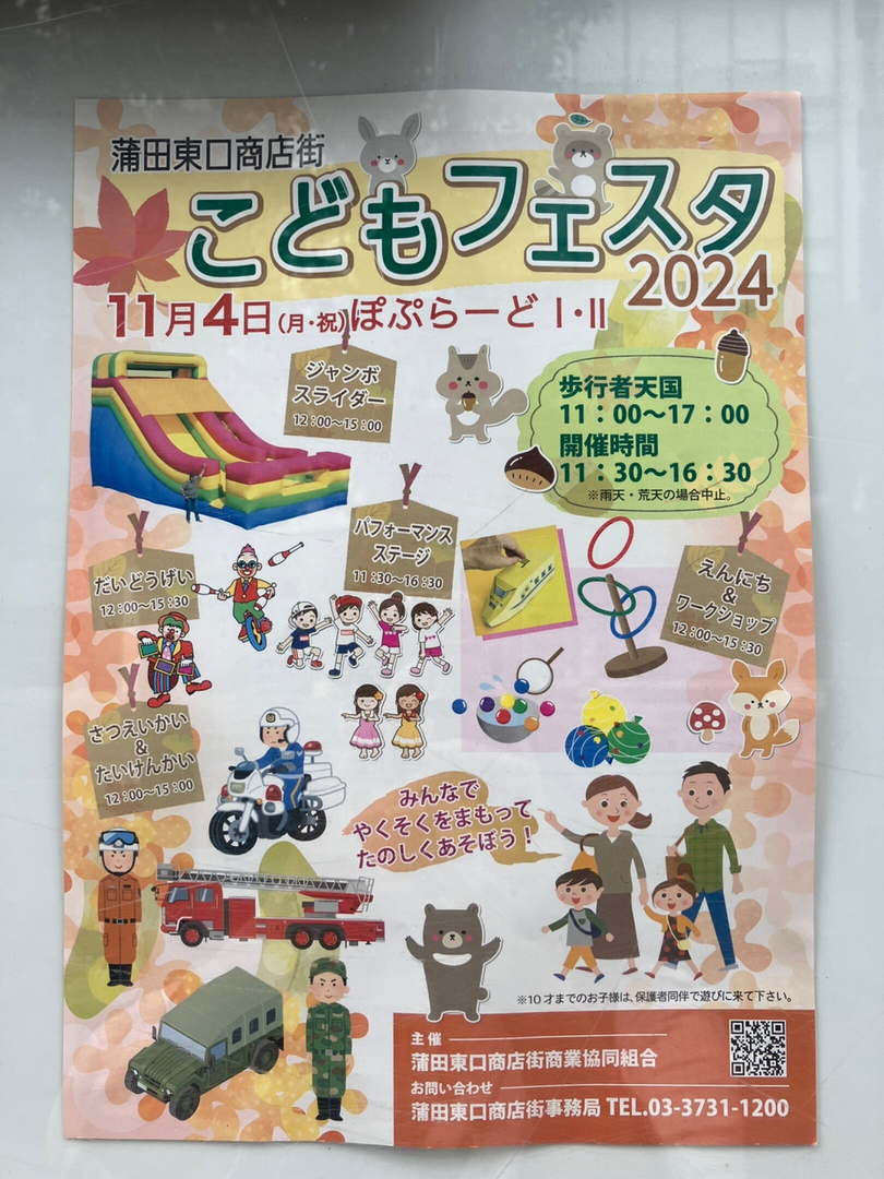 蒲田東口商店街で開催されるこどもフェスタ2024では、歩行者天国やジャンボスライダー、パフォーマンスステージ、だいどうげい、ワークショップ、さつえいかい&たいけんかいなどが行われます。イベントは11月4日(月・祝)に開催され、雨天・荒天の場合は中止となります。10才までのお子様は、保護者同伴で遊びに来てください。