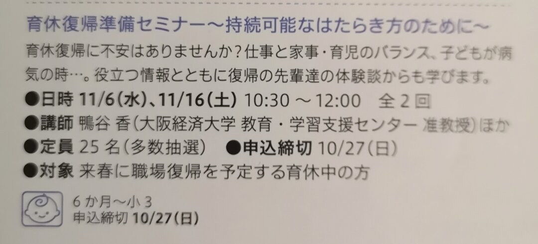 育休復帰に不安はありませんか?仕事と家事、育児のバランス、子供が病気の時、役立つ情報とともに復帰の先輩達の体験談から学ぶセミナーです。講師は鴨谷香(大阪経済大学 教育・学習支援センター 准教授)ほか。定員は25名で、多数の場合は抽選となります。対象は来春に職場復帰を予定する育休中の方で、6か月から小3までのお子様をお持ちの方です。申込締切は10月27日です。
