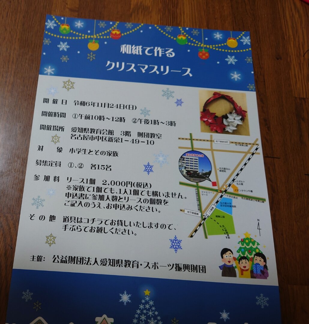 愛知県教育会館で和紙を使ったクリスマスリース作りのイベントがあります。道具は貸してもらえるので手ぶらで参加できます。対象は小学生とその家族です。開催時間は午前10時から12時と午後1時から3時の2回です。募集定員は各回15名で、参加料はリース1個につき2,000円(税込)です。家族で1個でも、1人1個でも構いません。申込書に参加人数とリースの個数をご記入のうえ、お申込みください。
