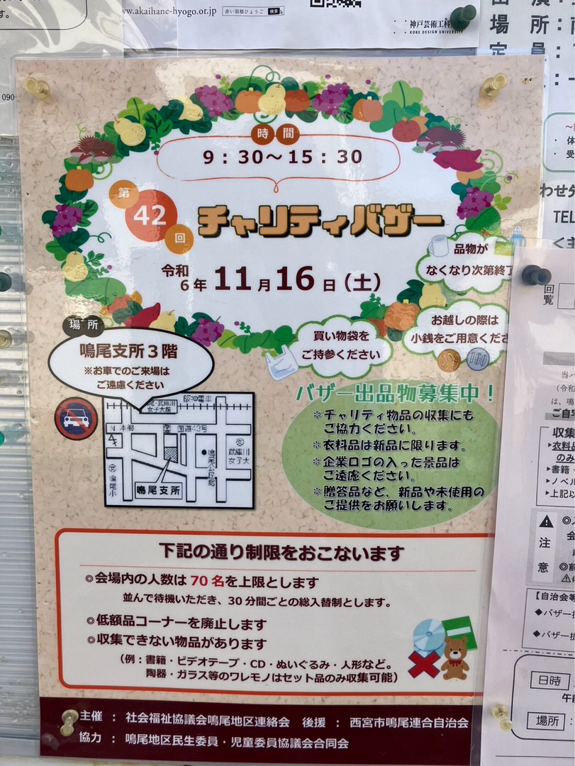 第42回チャリティバザーが鳴尾支所3階で開催されます。開催時間は9:30から15:30ですが、品物がなくなり次第終了となります。昨年参加した人によると、掘り出し物があるとのことです。小銭と買い物袋を持ってお出かけください。お車でのご来場はご遠慮ください。バザー出品物も募集中です。衣料品は新品に限ります。企業ロゴの入った景品はご遠慮ください。贈答品など、新品や未使用のご提供をお願いします。会場内の人数は70名を上限とし、30分間ごとの総入替制となります。低額品コーナーは廃止されます。収集できない物品もありますのでご注意ください。