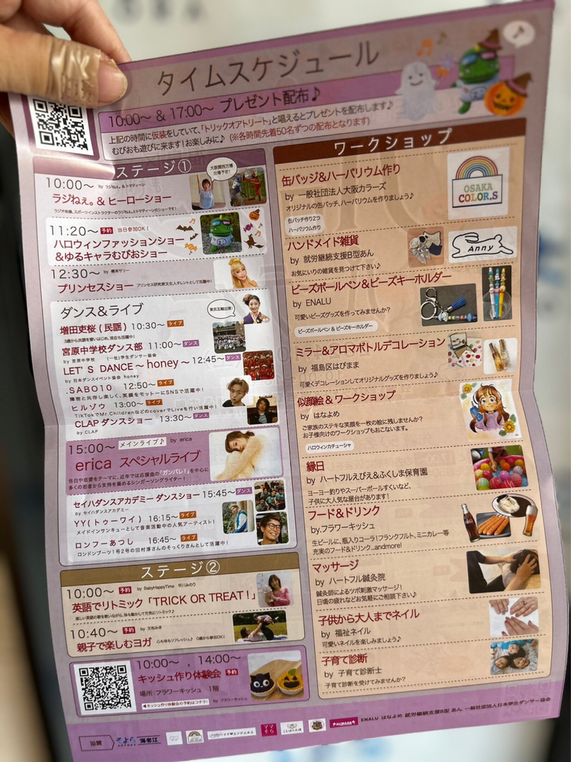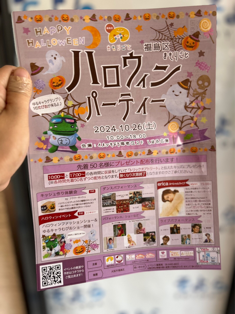 イオンそよら海老江にてハロウィンイベントがあります!ダンスやスペシャルライブ、ゆるキャラが遊びに来たりと盛りだくさん。先着50名様にプレゼントもあります。キッシュ作り体験会やダンスパフォーマンス、ericaのスペシャルライブなど、多彩なプログラムが用意されています。仮装をして「トリックオアトリート」と唱えるとプレゼントがもらえます。参加の予約はQRコードから可能です。
