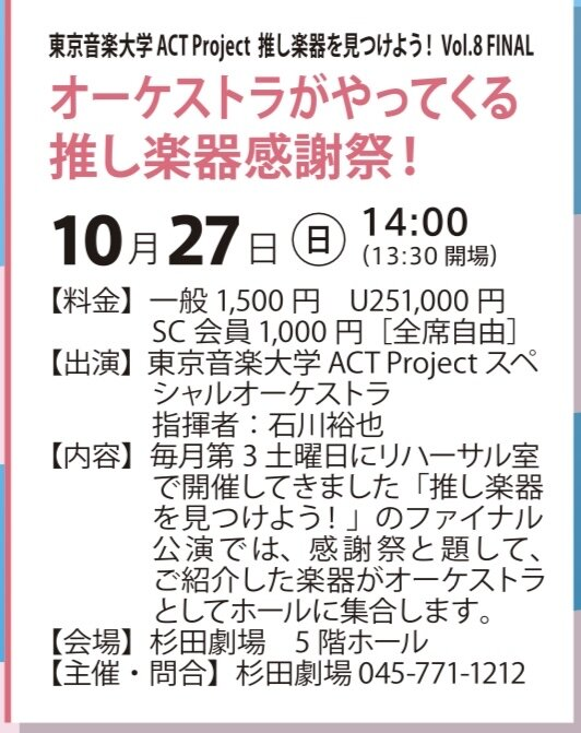 過去に開催された、「推し楽器を見つけよう!」の最後のイベントです。新杉田駅近くの杉田劇場で開催されます。様々な楽器が登場してオーケストラに編成されます。東京音楽大学のスペシャルオーケストラが出演します。