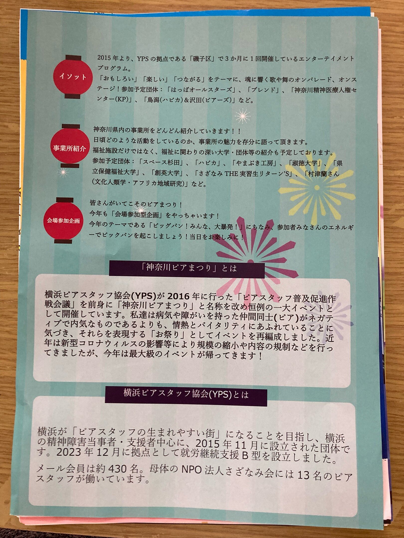 「神奈川ピアまつり」とは、横浜ピアスタッフ協会 (YPS)が2016年に行った「ピアスタッフ普及促進作戦会議」を前身に、「神奈川ピアまつり」と名称を改め恒例の一大イベントとして開催しています。私達は病気や障がいを持った仲間同士 (ピア)がネガティブで内気なものであるよりも、情熱とバイタリティにあふれていることに気づき、それらを表現する「お祭り」としてイベントを再編成しました。近年は新型コロナウィルスの影響等により規模の縮小や内容の規制などを行ってきましたが、今年は最大級のイベントが帰ってきます!