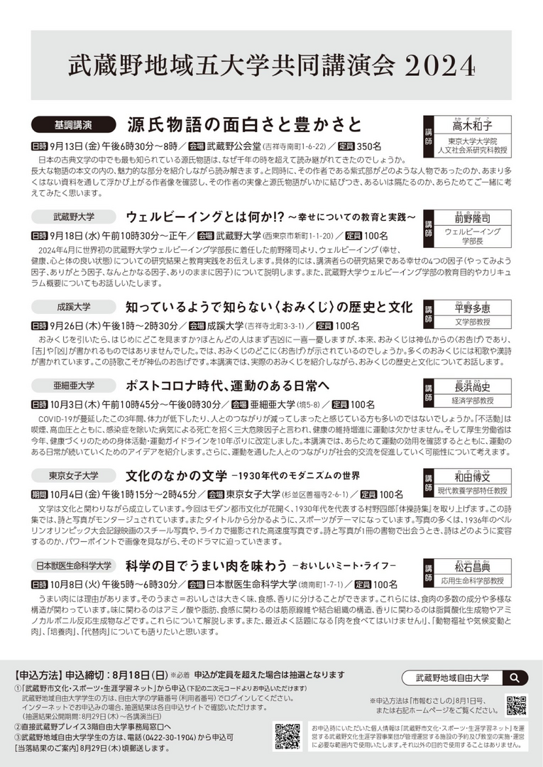 武蔵野地域五大学共同講演会2024が開催されます。基調講演や各大学の講座が予定されています。参加費は無料で、事前申込が必要です。申込締切は8月18日です。詳細は以下の通りです。
