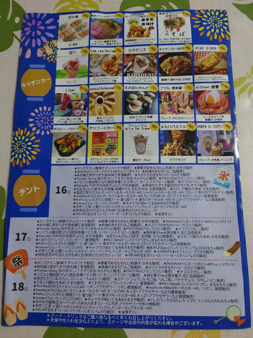 ホルモン焼肉笑炎、御菓子処せんのんじ、長瀬商店、The 9 Cloud、手作り工房 心愛、ばん楽、CAFE&SAKE、スマイルボックスダイニングあらし、自家製唐揚げ、和中ダイニング、ぶきっと、Lea Lea Shrimp、カラデニズ、MOCO PINE DINER、Liber、KARADENIZ、coco.kitchencar、えみばんさんど、フクルー福来留、テツフードカー、Mille for Crepe、フィレンツェ、メルハバカフェ、CREPE DI TUTTI、TUTTI、ゼルビーノカトウ、キングチキン、あめ細工家きたきや、5kitchen、林檎のきもち、カステラのきもち、Korean dining 母の手、YOLO Plus、ジビエと腸詰屋ひなた商店、ナマステ、Pancake FUKURO、常滑のキクイモ屋、天むすよしだ屋、スタンド綿、tonatsu、Kafuu.、toooa+、キャラクロ、手作り工房 心愛、特例認定NPO法人えがお咲く丘、3BLAB、焼き菓子taso、焼きたてパン & カフェレストふぉ~ちゅん、スイーツシュクレ、スタンド錦、くまので、Rili Lipine、Purrfect、sachi.cm.ribbon、木のもの雑貨店、トレカマックス2